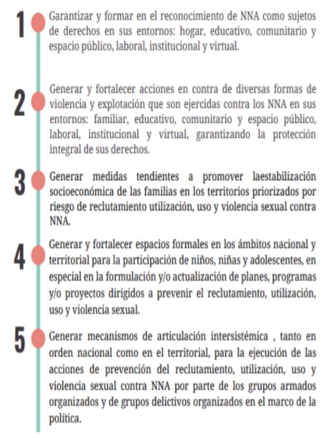 Para abordar las acciones que está tomando el Gobierno Nacional es necesario centrarse en la política pública que está vigente, puesto que el documento CONPES 3673 de 2010 con una vigencia prevista para cuatro años no se encuentra en vigor. Así, la línea de política pública, adoptada en 2019, en cabeza del Presidente de la República, Iván Duque Márquez, y la Consejería Presidencial para los Derechos Humanos y Asuntos Internacional con lo liderazgo de Nancy Patricia Gutiérrez Castañeda consiste en la “Prevención del reclutamiento, utilización, uso y violencia sexual contra niños, niñas y adolescentes por parte de grupos armados organizados (GAO) y grupos delictivos organizados (GDO)”. En la política pública se entiende por “reclutamiento” la separación física de su entorno familiar y comunitario para la participación directa de NNA en actividades bélicas o militares o en actividades tácticas, de sustento o cualquier otro rol en relación con los combatientes de GAO o GDO. También se entiende por “utilización” la participación indirecta de NNA en otras formas de participación o vinculación, sea permanente u ocasional, en los GAO o GDO. Finalmente, por “uso” se entiende las prácticas o comportamientos de quienes promuevan, induzcan, faciliten, financien, colaboren o participen en que los NNA intervengan en cualquier actividad ilegal de los GAO o GDO (Consejería Presidencial para los Derechos Humanos y Asuntos Internacionales, 2019).